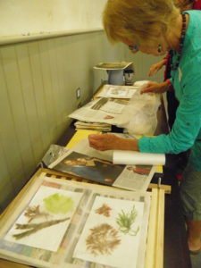 The group then went on to experiment with arranging and placing various specimens on paper using the methods that Alice described. These were then carefully transferred to the bespoke seaweed presses that Alice provided and layered ready for pressing.